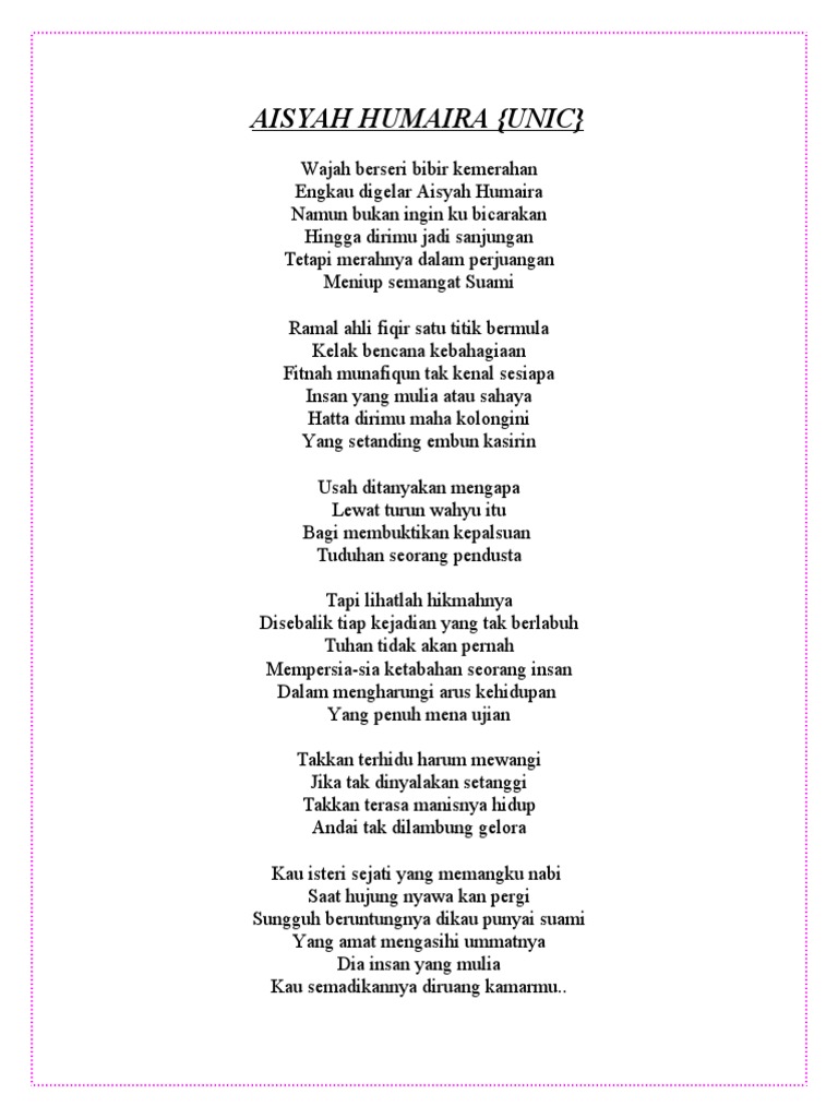 Kisah tersebut diriwatkan Ahmad. MENYEDIAKAN LIRIK-LIRIK LAGU YANG BEST. Aisyah Romantisnya cintamu dengan nabi Dengan baginda kau pernah main lari-lari Selalu bersama hingga ujung nyawa Kau disamping rasullallah Aisyah Sungguh manis oh sirah kasih cintamu Bukan persis novel mula benci jadi rindu Kau istri tercinta Ya aisyah ya Humairah Rasul sayang kasih rasul cintamu Mulia indah cantik berseri Kulit putih.